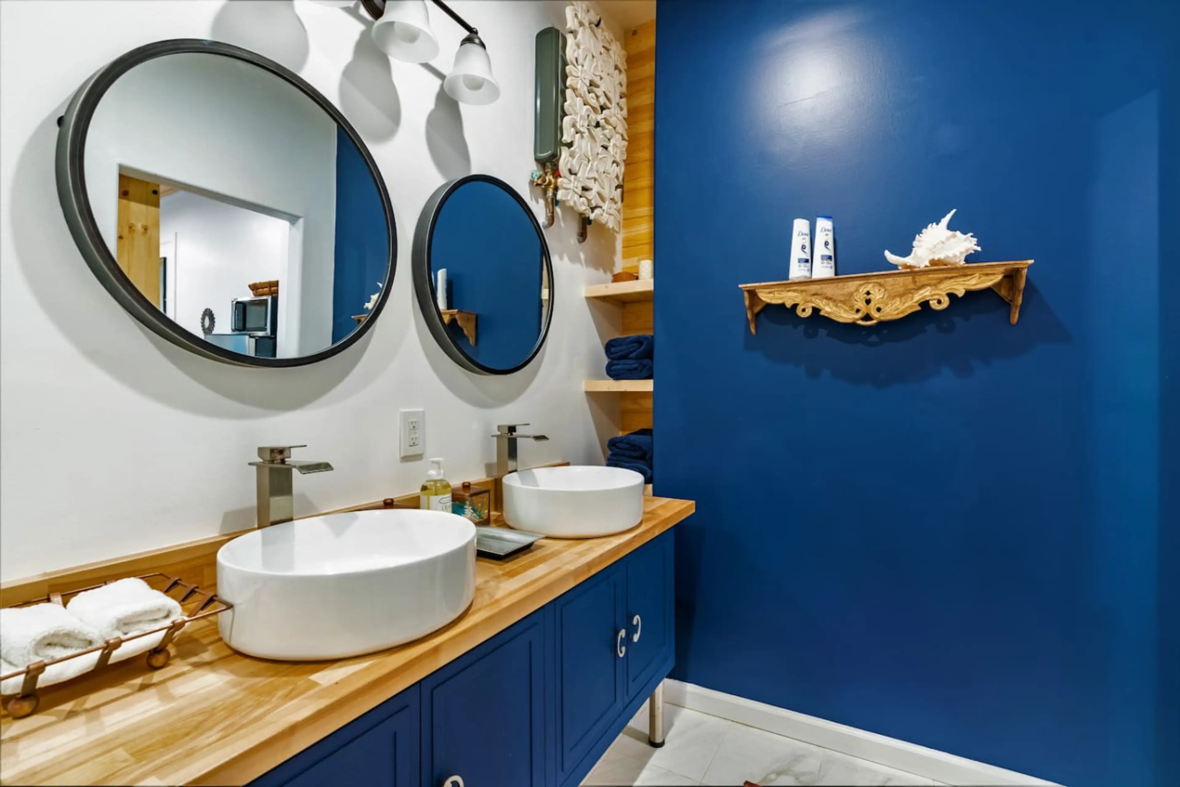 Negative: If I had to say anything, there were no shelves IN the Shower, but the bathroom was Great, and the bathroom slider door did not close tight.